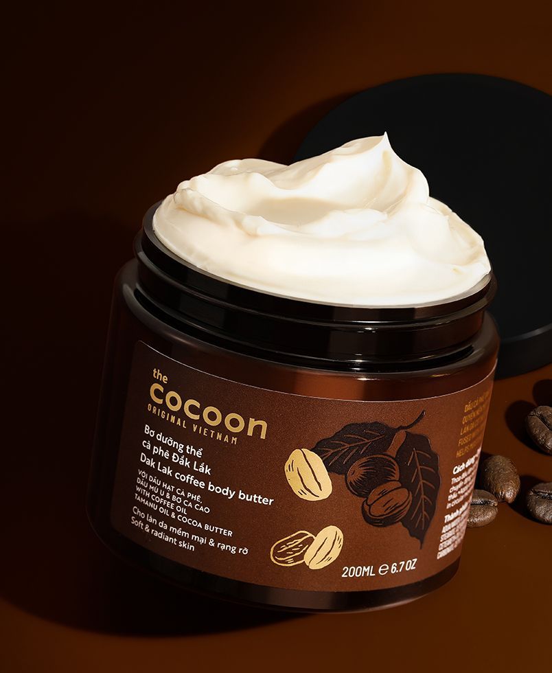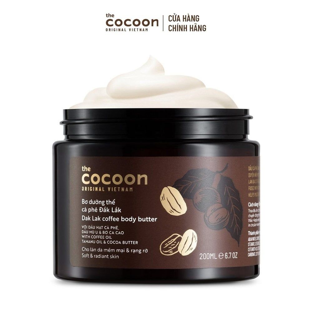 Bơ Dưỡng Thể Cocoon Chiết Xuất Cà Phê Đắk Lắk 200ml là dòng dưỡng ẩm toàn thân đến từ mỹ phẩm thuần chay Cocoon của Việt Nam, với thành phần chính từ dầu cà phê Đắk Lắk giàu cafein giúp chống oxy hoá, phục hồi và giữ lại độ ẩm cho làn da, làm đều màu da và mang đến sự khỏe khoắn, tươi mới.