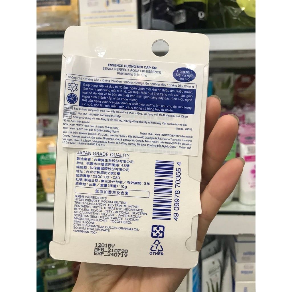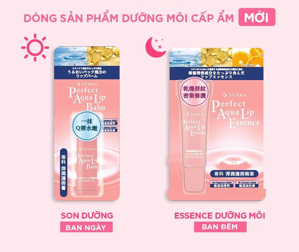 Tinh Chất Dưỡng Môi Senka Perfect Aqua Lip Essence 10g là dòng son dưỡng đến từ thương hiệu mỹ phẩm Senka của Nhật Bản, với công thức chứa Hyaluronic Acid, Vitamin E và chiết xuất cam phục hồi độ ẩm tự nhiên cho môi lúc ngủ giúp giải quyết 5 vấn đề của môi: nếp nhăn, khô tróc, nứt nẻ, nhiều da chết, xỉn màu.