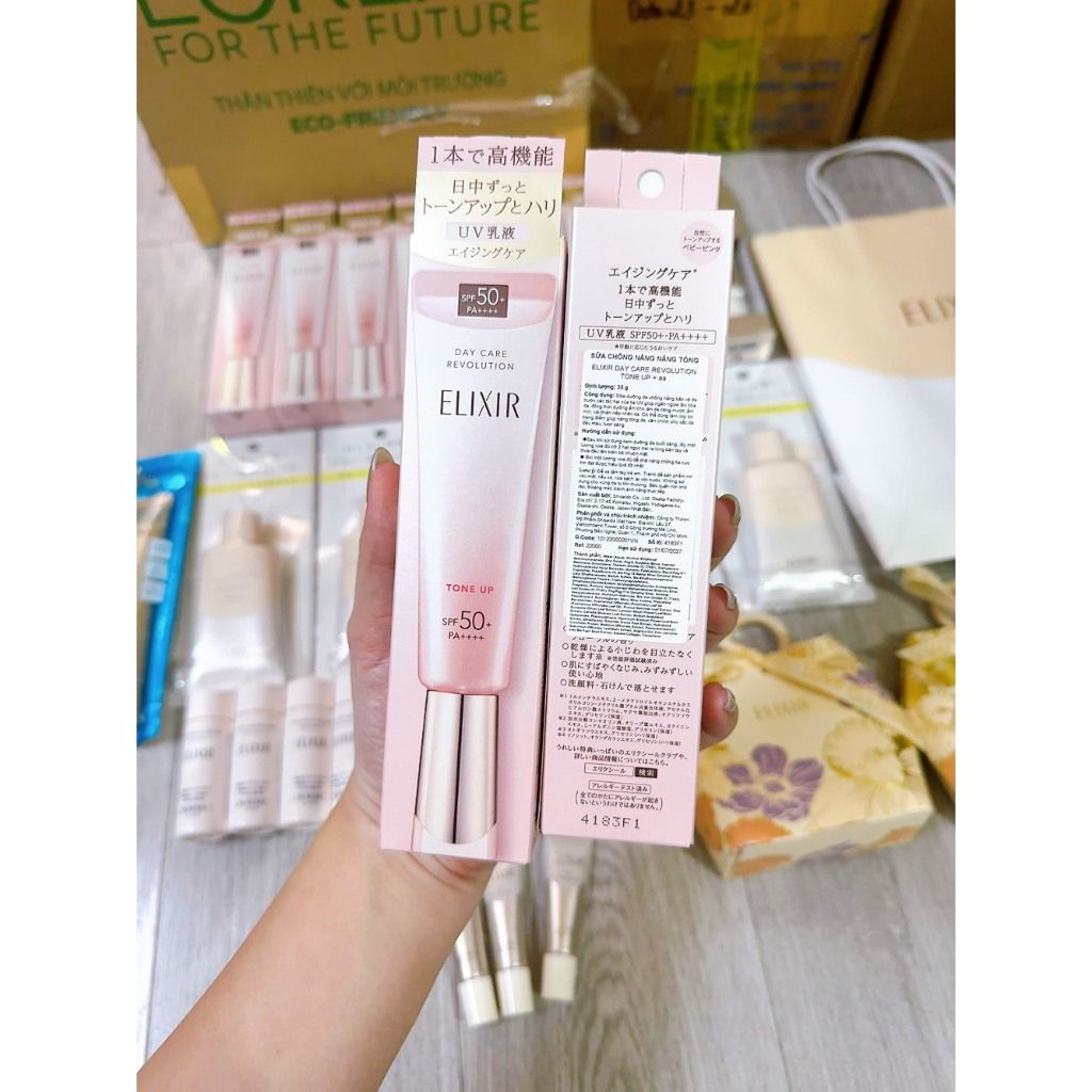 Kem Chống Nắng Nâng Tone Shiseido Elixir Day Care Revolution Tone Up SPF 50+ PA++++ 35gr
