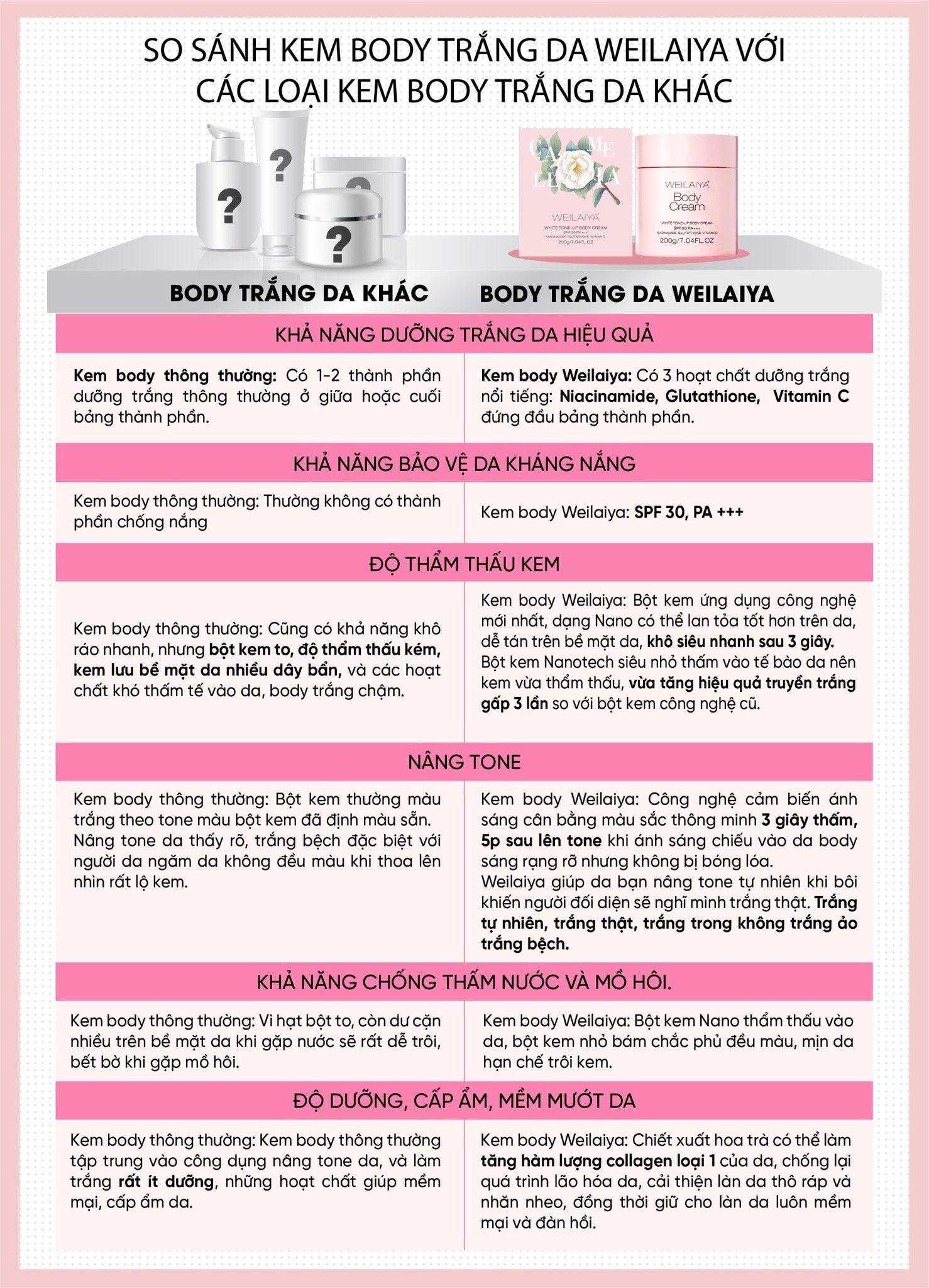 📌Ứng dụng công nghệ "cảm biến sáng" đang rất hot tại Châu Á vào kem kích trắng nâng tone da body đem lại hiệu ứng trắng trong toả sáng sang trọng.