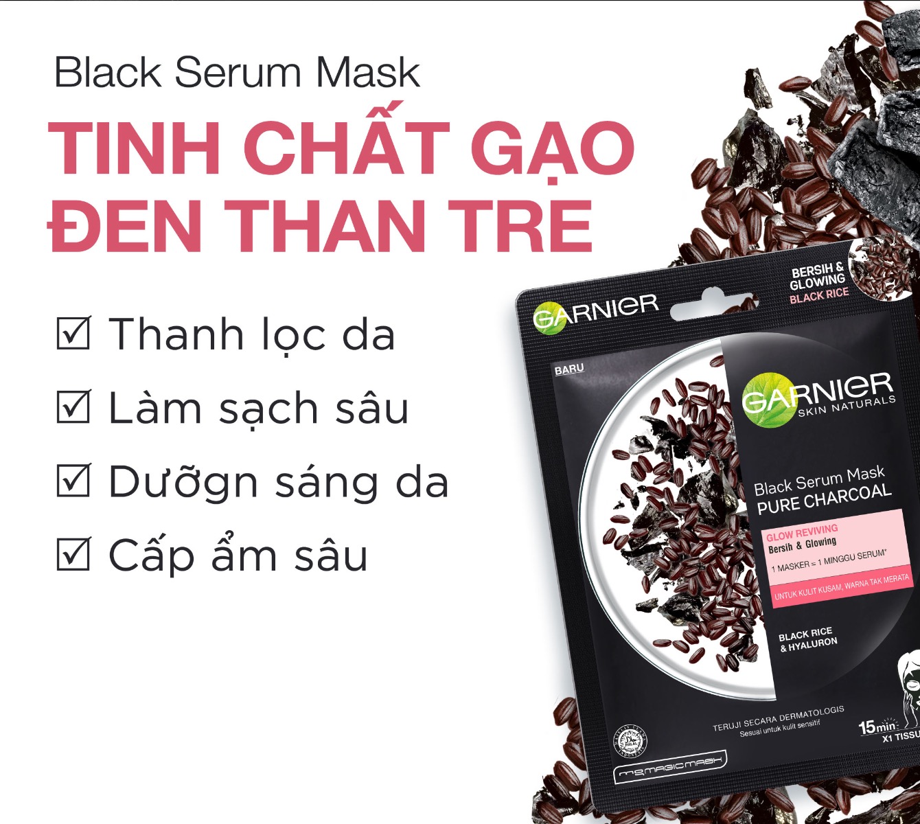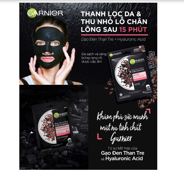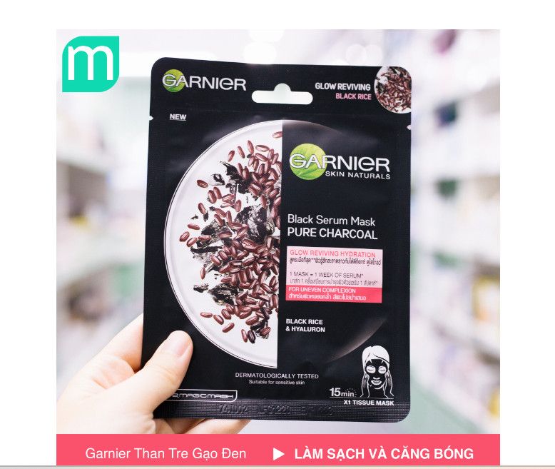 Mặt Nạ Garnier Black Serum Mask Black Rice: than tre gạo đen – thanh lọc và cung cấp độ ẩm cho da thiếu sức sống