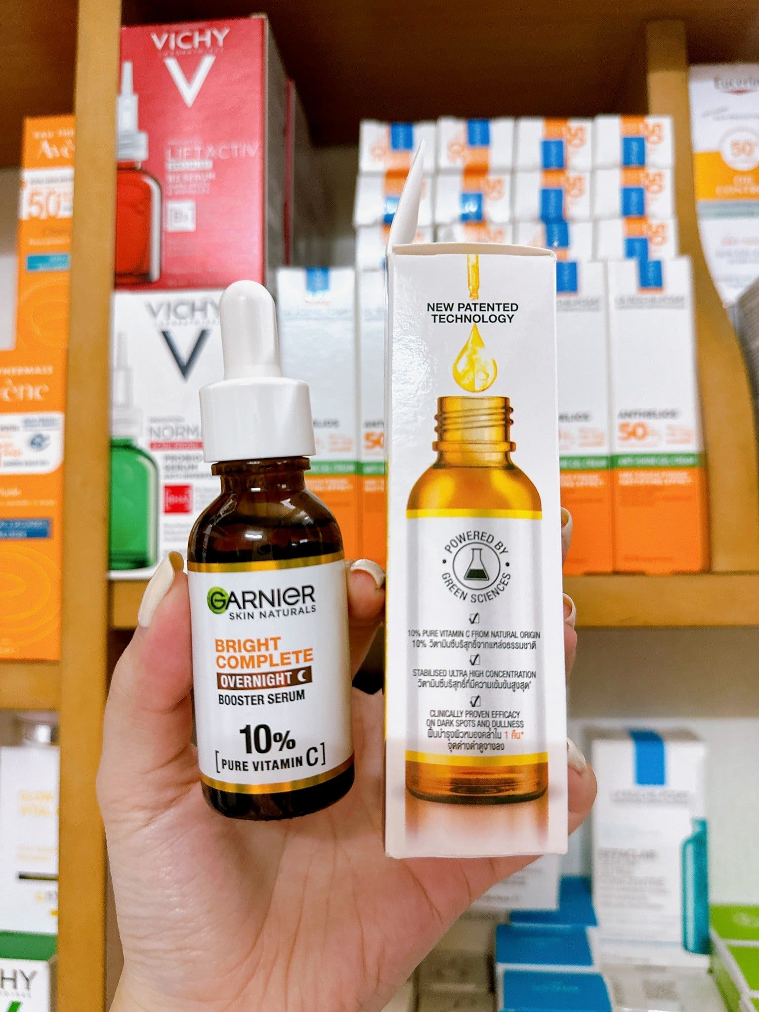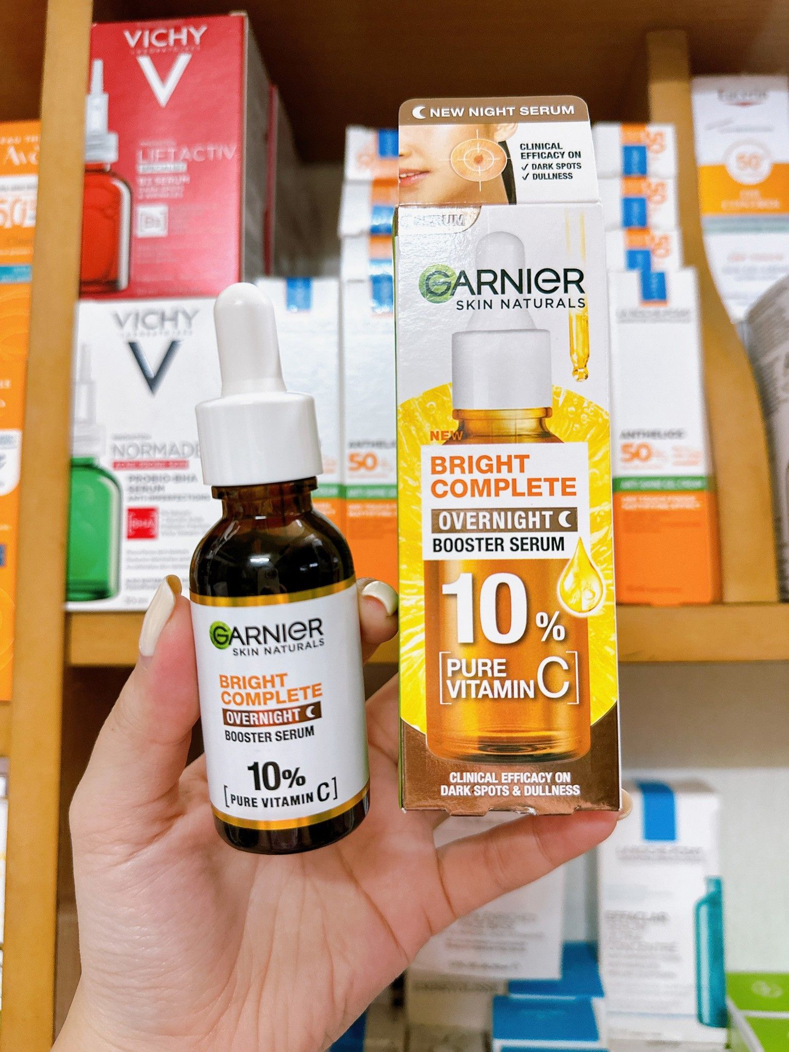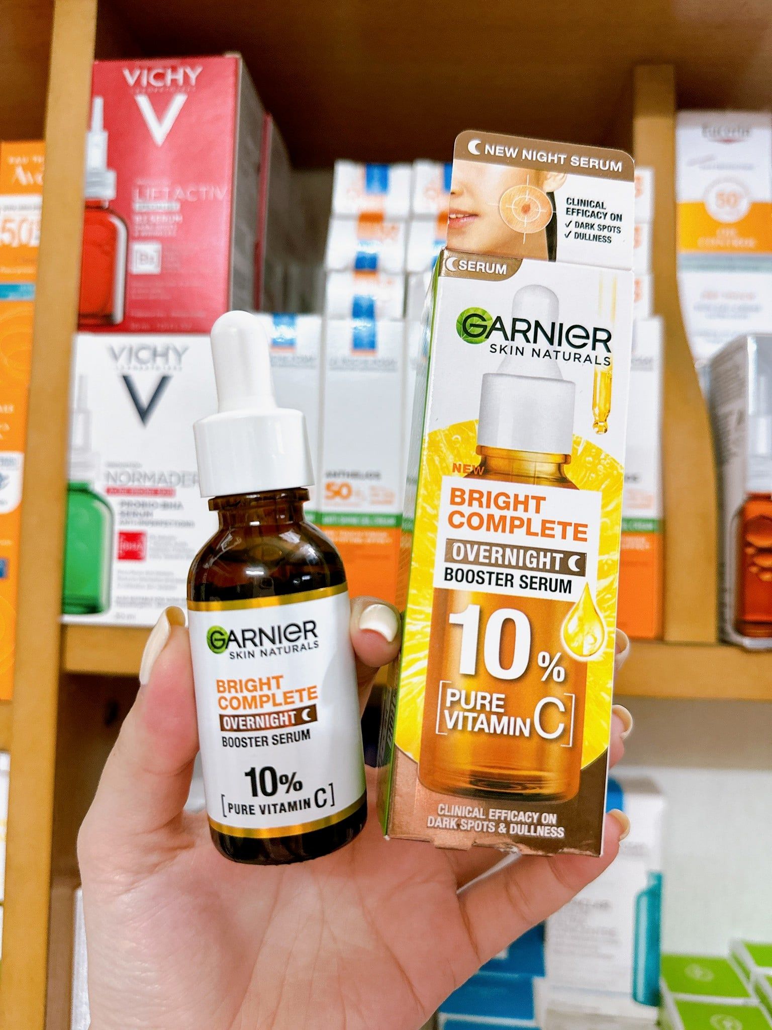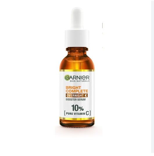 Serum Garnier 10% Vitamin C - Bright Complete Overnight Serum Tăng Cường Sáng Da Mờ Thâm Ban Đêm 30ml với công thức đậm đặc chứa 10% vitamin C nguyên chất có nguồn gốc tự nhiên và axit hyaluronic thúc đẩy quá trình tái tạo da trong khi bạn ngủ.