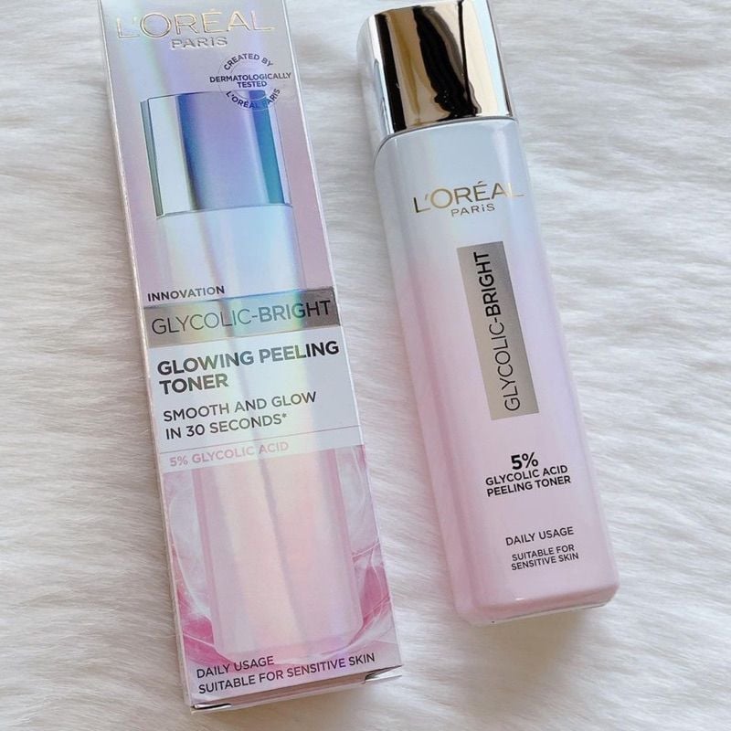 Nước dưỡng L’Oréal Paris Glycolic Bright Peeling Toner với 5% Glycolic Acid giúp thúc đẩy tái tạo da, làn da trông trắng sáng, căng mịn từ sau 1 tuần.